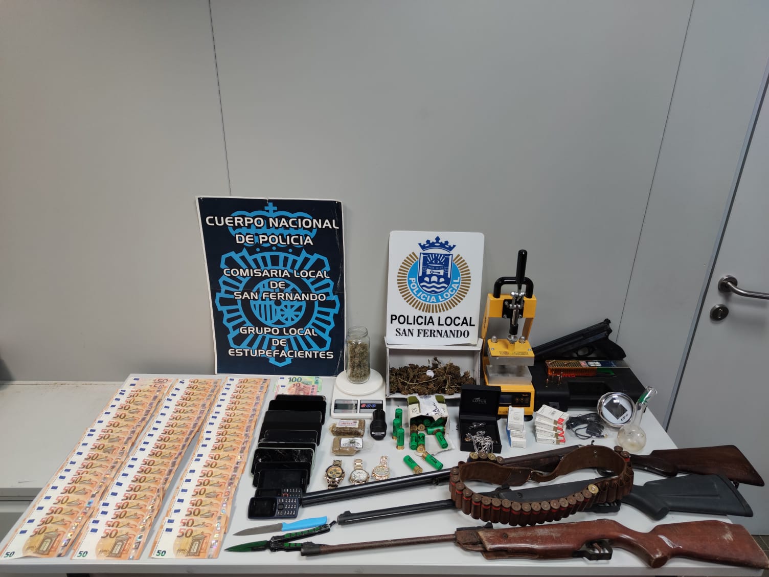 Los agentes han intervenido una narcolancha, una prensa hidráulica, tres balanzas de precisión, 183 gramos de hachís, 142 grs de
