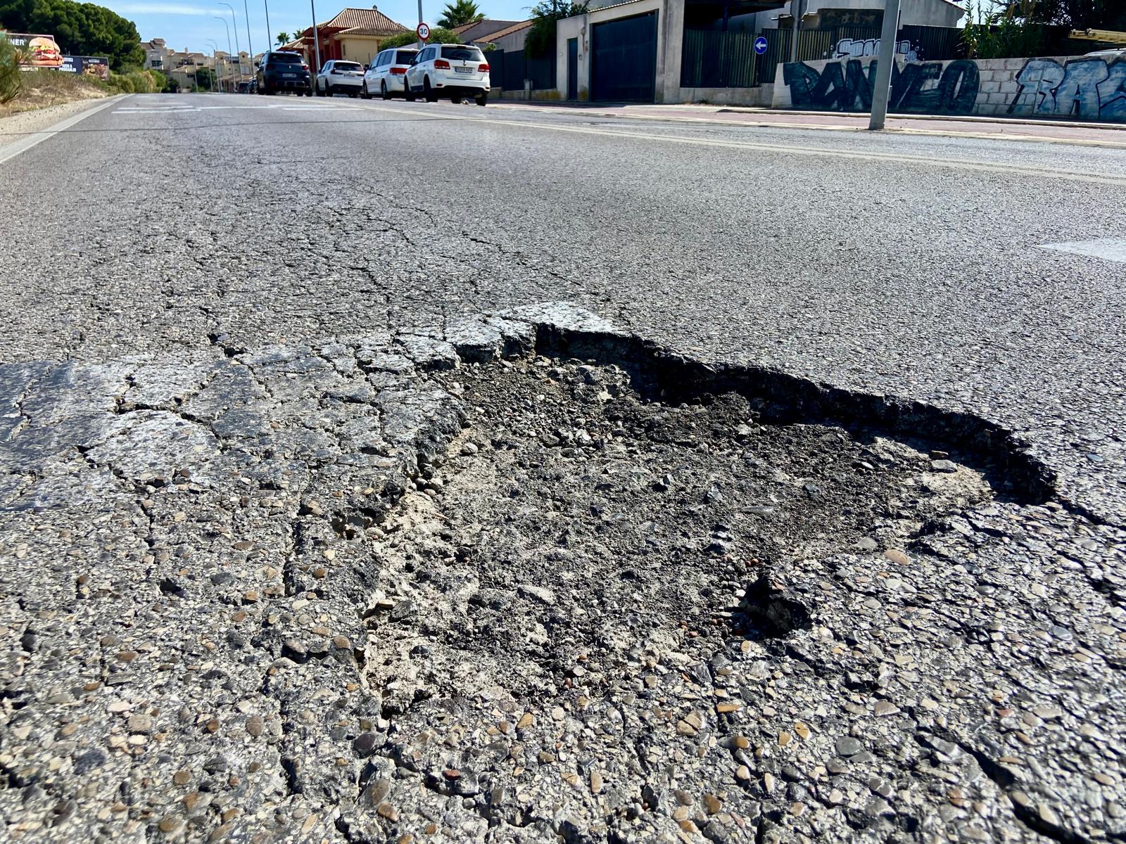 Los vecinos de Costa Oeste alertan del riesgo que suponen los baches en una de las vías más transitadas de