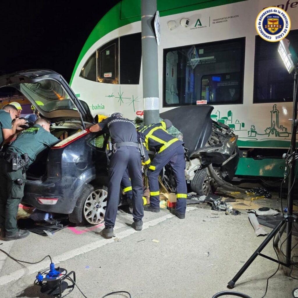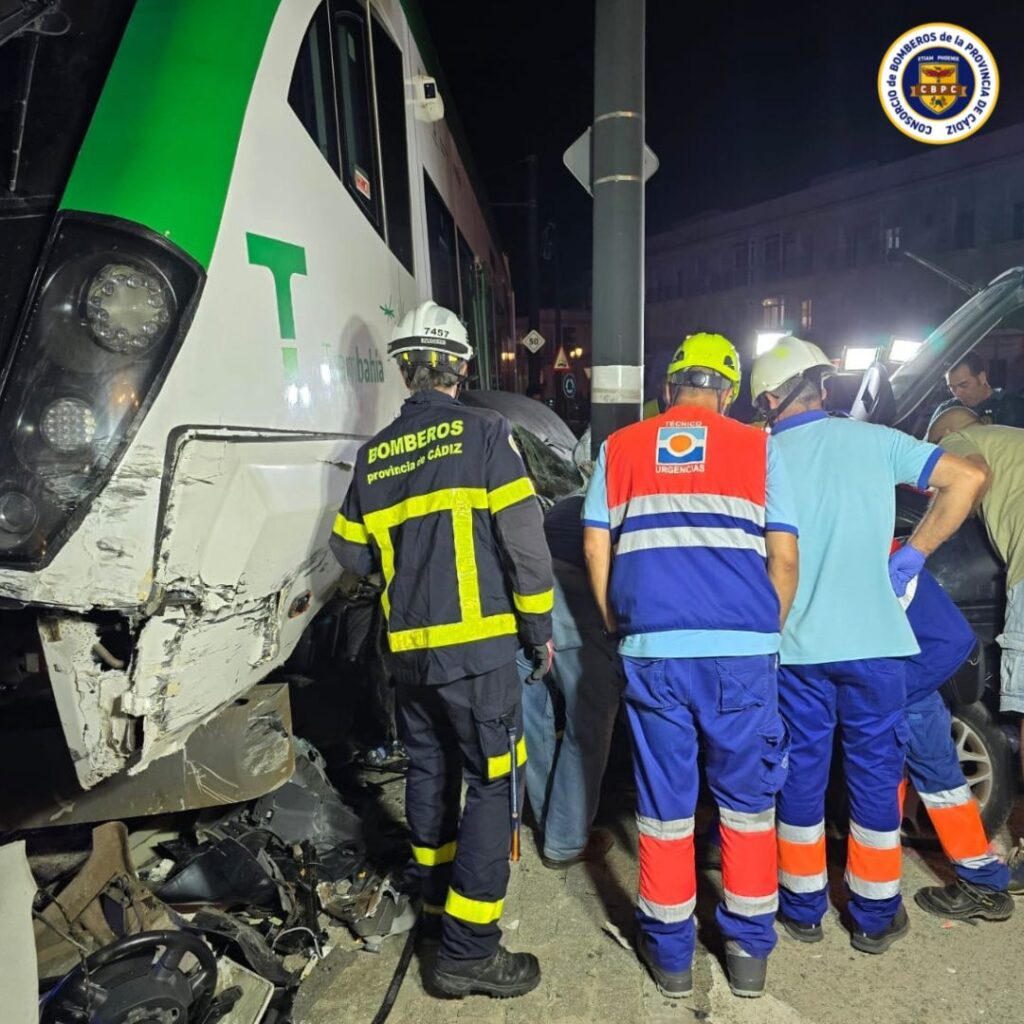 Efectivos del bomberos del parque de Chiclana han actuado para rescatar a dos personas atrapadas tras un accidente ocurrido entre un turismo y el trambahía, en la rotonda entre la Avenida de los Reyes Católicos y el Puente de Nuestra Señora de los Remedios. Los ocupantes eran una mujer y su hijo, de 13 años.