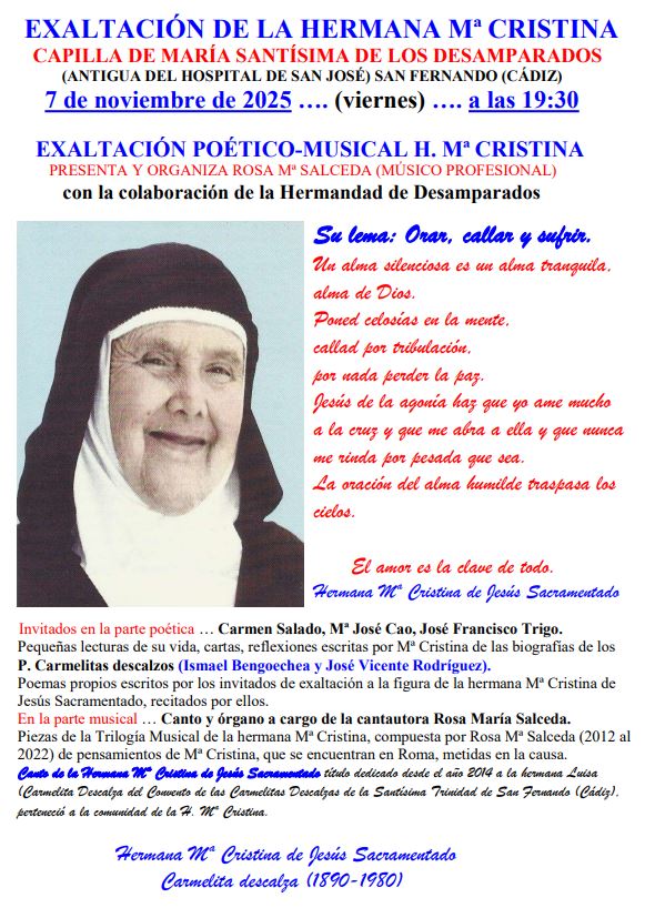 La Hermandad de Desamparados anuncia que el próximo viernes 7 de noviembre, tendrá lugar una Exaltación Poético-Musical a la Hermana