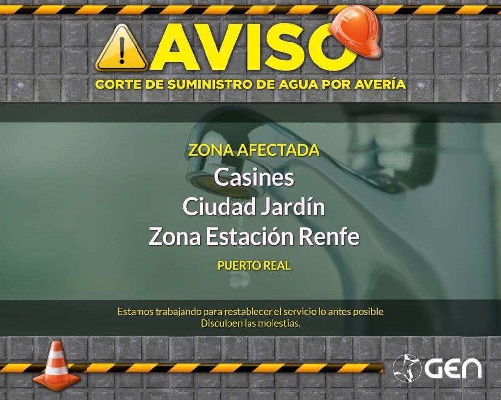 El Ayuntamiento de Puerto Real ha informado a través de sus redes sociales que los operarios continúan trabajando en la avería ubicada en la red arterial de abastecimiento (DN 450 mm), en el entronque hacia la zona de Casines.