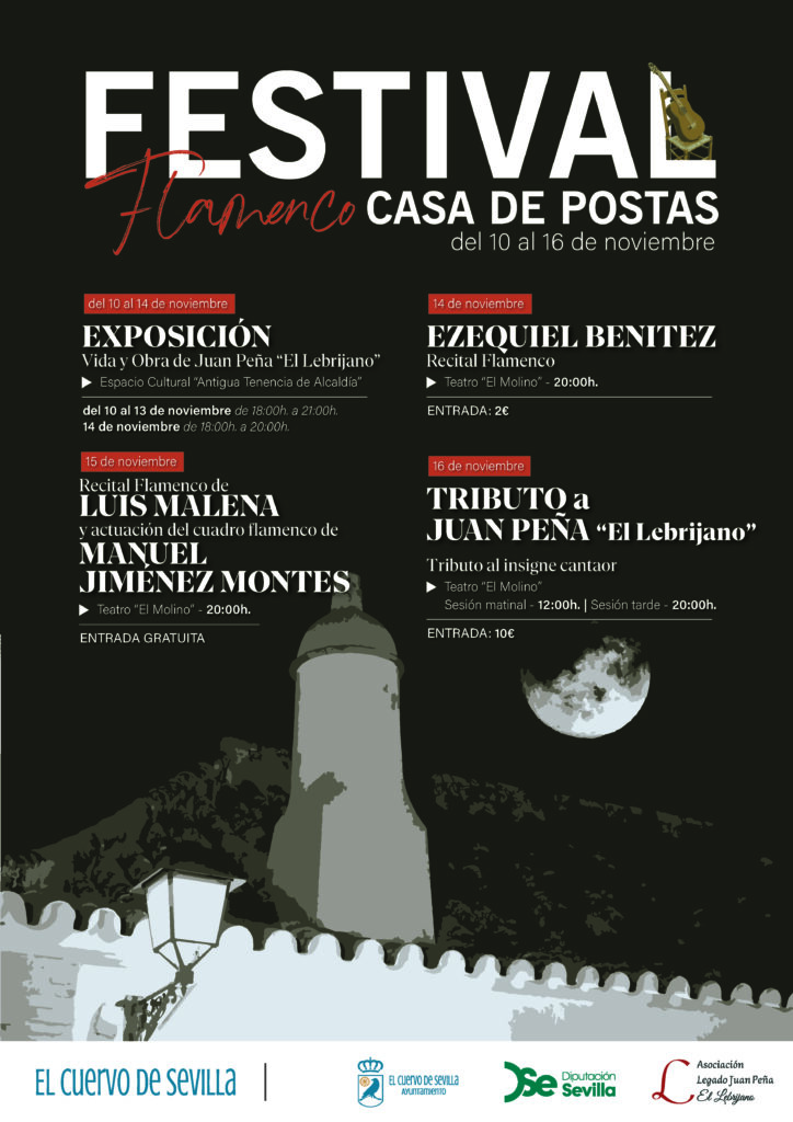 El alcalde de El Cuervo de Sevilla, José Manuel Oliva, ha anunciado que la localidad se vestirá de arte y duende con una nueva edición del Festival Flamenco “Casa de Postas”. El mismo se celebrará del 10 al 16 de noviembre, con una variada programación de recitales, exposiciones y homenajes al legado del cante en la comarca.