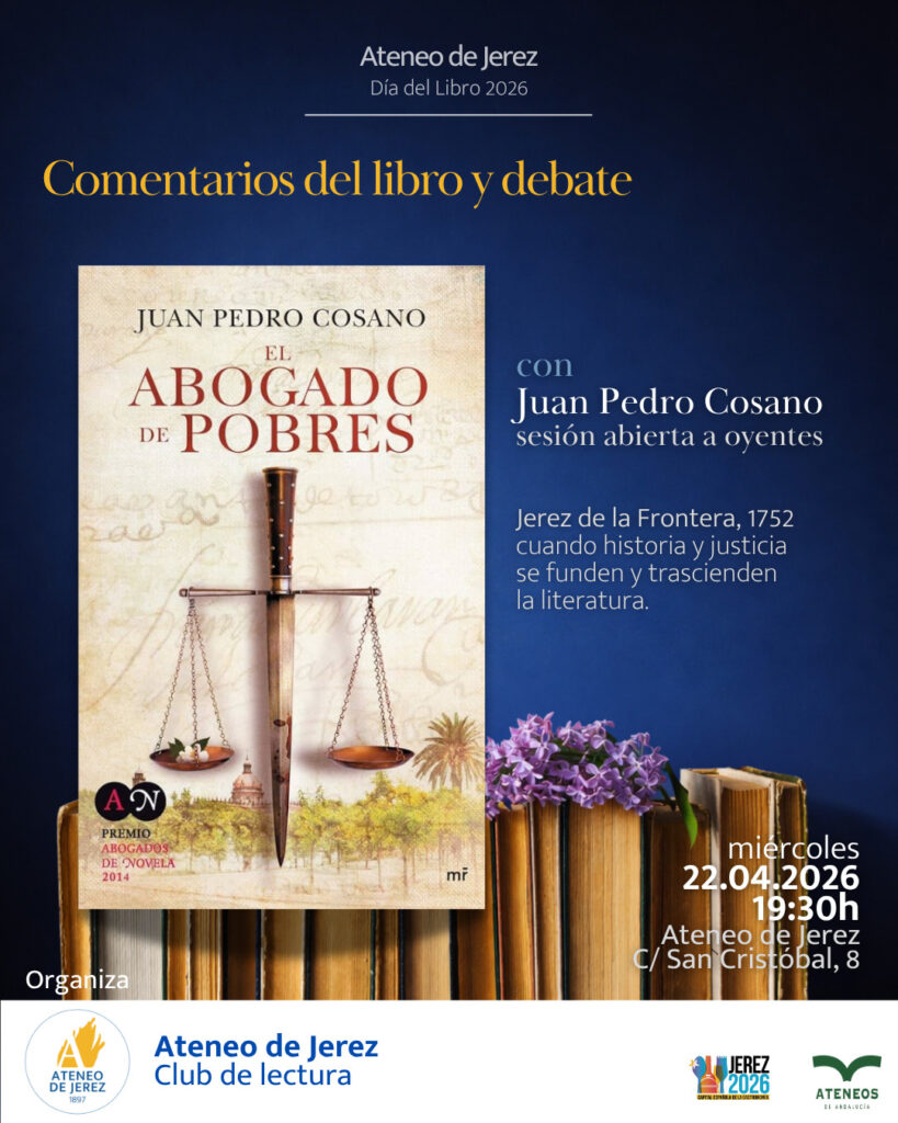 Dentro de las actividades que el Ateneo de Jerez está desarrollando en torno al día internacional del libro que se celebra el 23 de abril, el miércoles 22 llevará a cabo una sesión abierta del club de lectura con la participación del escritor Juan Pedro Cosano, autor de la novela “El abogado de pobres” cuya historia se ubica en un Jerez castizo. La sesión de debate entre los miembros del club de lectura del Ateneo de Jerez, se ofrecerá abierta para que quien lo desee pueda disfrutar del debate. El acto comenzará a las 19:30 horas en la sede del Ateneo de Jerez, sito en la calle San Cristóbal número 8. La entrada es libre hasta completar aforo.