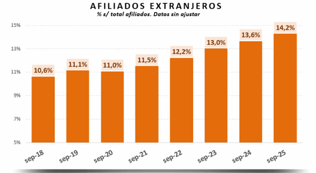 Por otra parte, las mujeres representan ya el 43,2% del total de trabajadores foráneos, con 1.333.863 afiliadas extranjeras al sistema.