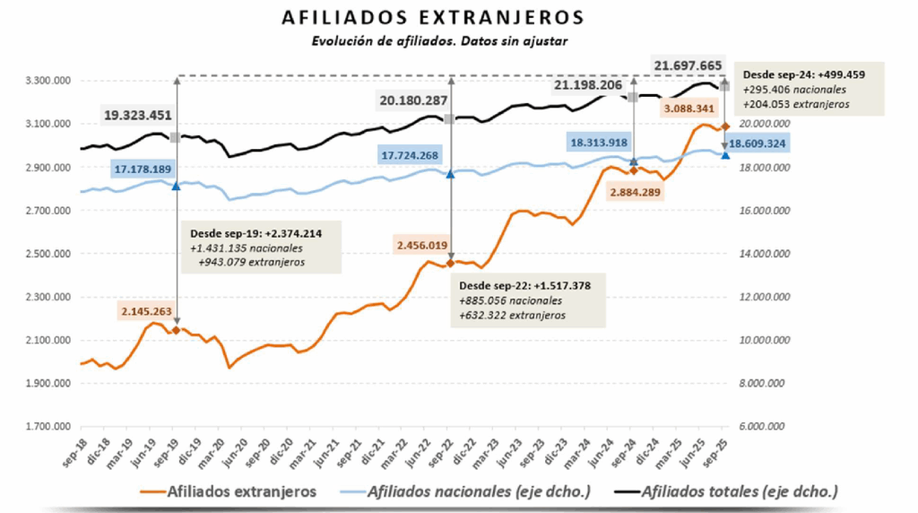 En todo el país, si se descuenta el efecto calendario, la cifra alcanza los 3.067.780 afiliados extranjeros en septiembre. Un mes más, la cifra de trabajadores procedentes de otros países supera los tres millones, tras sumar más de 200.000 ocupados en los últimos doce meses (202.694), lo que supone un +7,07% de variación interanual.