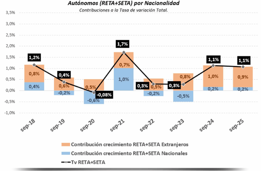 Este crecimiento es aún más relevante en sectores altamente cualificados: en el último año, el número de trabajadores extranjeros por cuenta propia ha aumentado un 27,9% en Información y Comunicaciones, en Suministro de Energía, el 24,3%, y un 18,5% en Actividades Profesionales, Científicas y Técnicas.