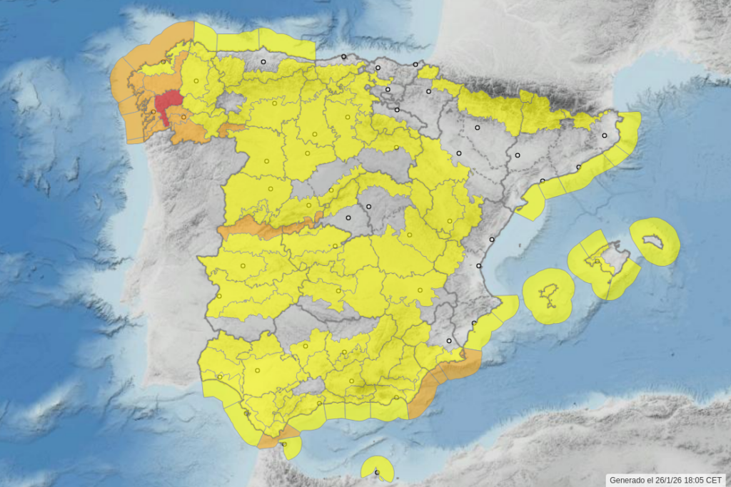 El lunes 26 y el martes 27 las precipitaciones afectarán principalmente al oeste peninsular, siendo Galicia la zona más afectada debido al elevado contenido de humedad de la atmósfera en el periodo. Los acumulados más importantes se esperan en puntos del interior de Pontevedra y noroeste de Ourense, donde podrían superarse los 120 litros/m2 en 12 horas, así como en los litorales atlánticos gallegos y suroeste de Ourense, donde localmente se superarán los 80 litros/m2. Durante el día de mañana, martes, además del realce orográfico del sistema Central, las precipitaciones se darán también a barlovento de los principales sistemas montañosos de la mitad sur, destacando el sistema Central occidental y el arco Bético. Además, en el suroeste de Andalucía, el gran contenido en humedad de la masa de aire puede dar lugar a chubascos localmente fuertes cerca de los litorales. Las temperaturas se mantendrán relativamente suaves, con ambiente templado en la mayor parte del territorio. El viento soplará de componente sur y suroeste con rachas moderadas.